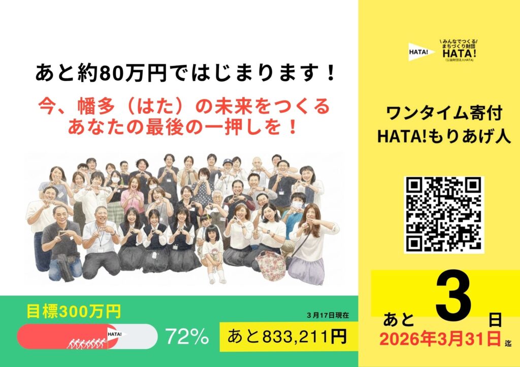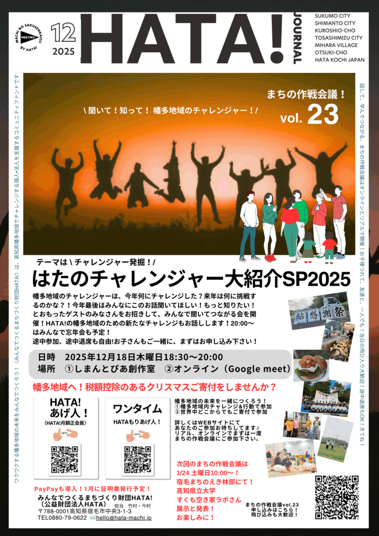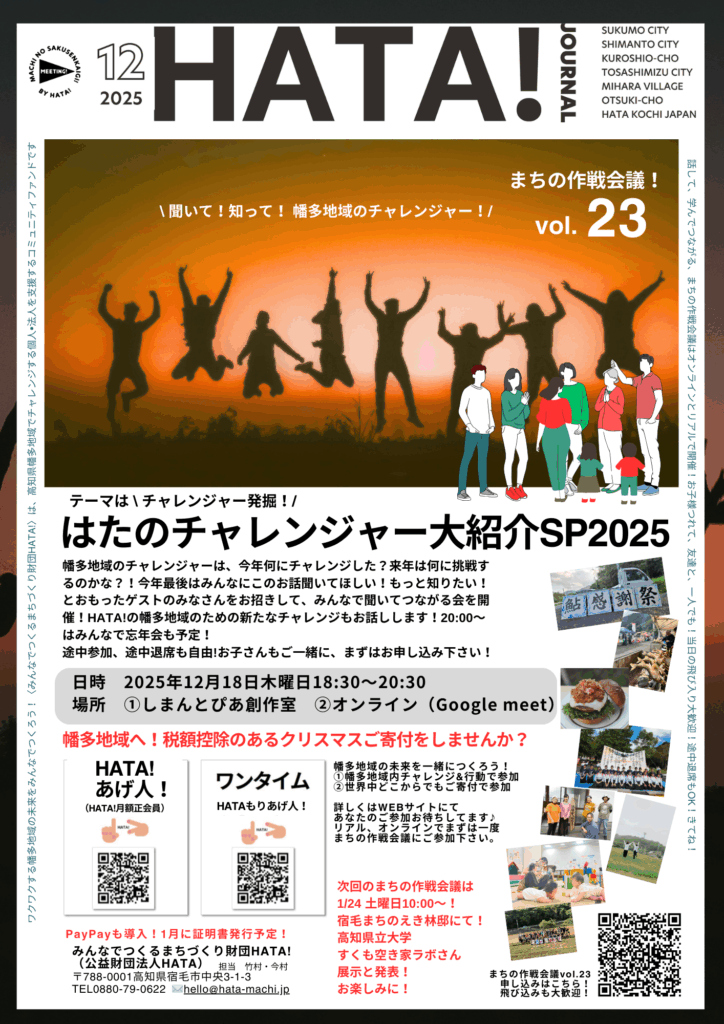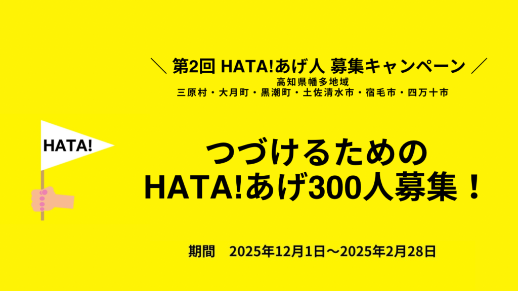 高知県幡多地域の三原村・大月町・黒潮町・土佐清水市・宿毛市・四万十市のワクワクする未来をみんなでつくるため、2024年4月、403名の”設立HATA揚げ人”の皆様と共にみんなでつくる まちづくり財団HATA!(一般財団法人HATA)を立ち上げました。2025年5月公益財団法人HATAに移行し活動中!