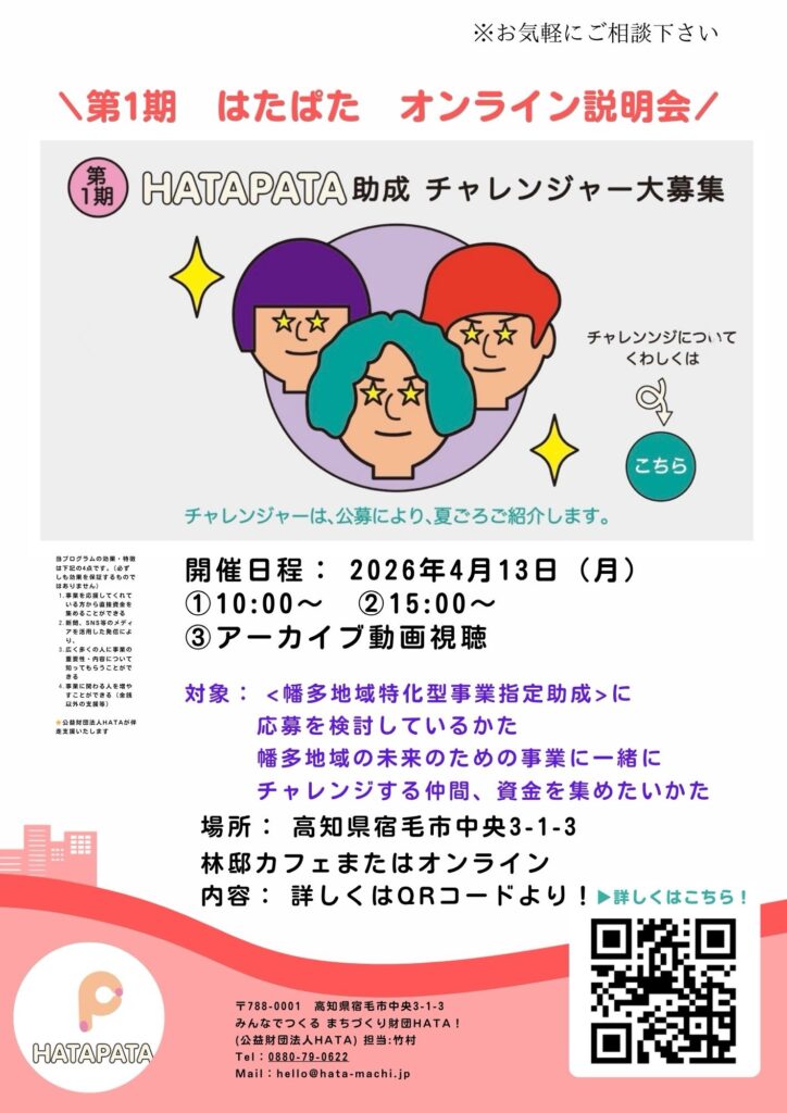 高知県幡多地域の地域課題の解決や地域の価値創造に繋がる事業に取り組むチャレンジャーを資金的支援と伴走支援で支えるため、「幡多のチャレンジャーのための応援助成プログラム」として2024年4月にスタートしましたテーマ型助成事業です。学生のチャレンジ・個人や団体の初めの一歩を寄付を原資としてみんなで支えます。
