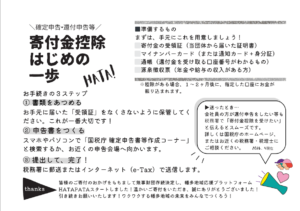 月額サポーターは1年分を年に1回まとめてご寄付をされた年の翌年1月に発行いたします。ワンタイム寄付につきましてはご寄付いただきました翌月上旬までに発行いたします。お急ぎの方いらっしゃいましたらご寄付の際にお申し出ください。領収証と税額控除の証明書は確定申告等の税制優遇を受ける際に必ず必要です。大切に保管してください。