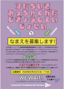 「はた地域密着型!事業指定助成」の愛称募集 (2026/1/28情報更新) 幡多地域(三原村・大月町・黒潮町・土佐清水市・宿毛市・四万十市)の新しい挑戦を応援するワクワク感が伝わる助成の名前を皆様から募集いたします!! 幡多地域の新しい応援の仕組み、名前を募集いたします!「あの人の挑戦を応援したい」「このまちをもっとおもしろくしたい」そんなあなたの想いとお金を、選んだ活動にダイレクトに届ける。2026年春、幡多地域で新しい「応援のカタチ」が始まります。みんなに愛される、とびきりの名前をつけてください! 応募はこちらをクリック 【募集要項】 募集内容: 「はた地域密着型!事業指定助成」の愛称 ※はた地域密着型!事業指定助成とは? ・応援したい『地元の活動』を自分で選んで、寄付できる仕組みです ・寄付型クラウドファンディング形式の新しい助成 ・HATA!が高知県幡多地域のチャレンジに伴走支援します ・地元を応援したい人と、地域の挑戦者をつなぐ応援の仕組み ・事業の募集は2026年春を予定しております。 こんな想いがあります 幡多地域のワクワクする未来、思いやりの循環、チャレンジの育成を感じさせるもの。 子どもからお年寄りまで、誰でも呼びやすく親しみやすいもの。 ■応募資格:どなたでも■締切: 2026年2月28日(土)16:00まで最終日はパンとイロイロフェスの公益財団法人HATAブースにてお預かりいたします!■賞: 採用作品(1点)賞状 + HATA!オリジナルグッズ■応募方法: WEBから:https://docs.google.com/forms/d/e/1FAIpQLSeQy7UNfRcUODbv3nY3YzHRuuXyYwi3NFI720YDxcuotb8y0w/viewform?usp=sharing&ouid=114860460341573134965(Googleフォーム)より送信 箱に入れる:下記の チラシ応募用紙に記入して「林邸カフェ」内の応募箱へ • 応募点数は1人3点までとします。 応募用紙 件名: 「はた助成 愛称応募」本文必要事項: 考案した愛称(ふりがな) その名前に込めた想い(理由・説明200文字以内) 氏名(ふりがな) 郵便番号・住所 電話番号 年齢(未成年の場合は保護者氏名) . 結果発表 2026年3月下旬採用された方