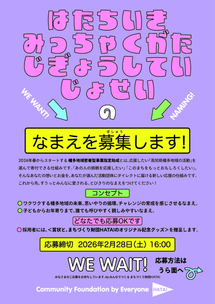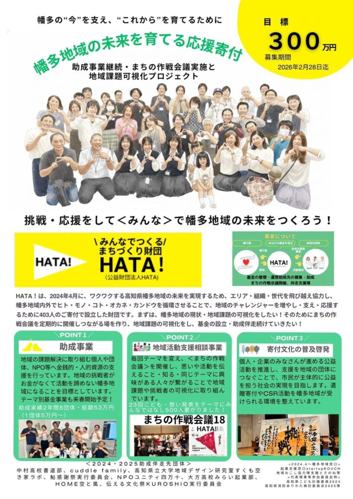 幡多地域密着型事業指定助成として名称募集をしたHATAPATAとは、寄付を原資とした助成事業です。