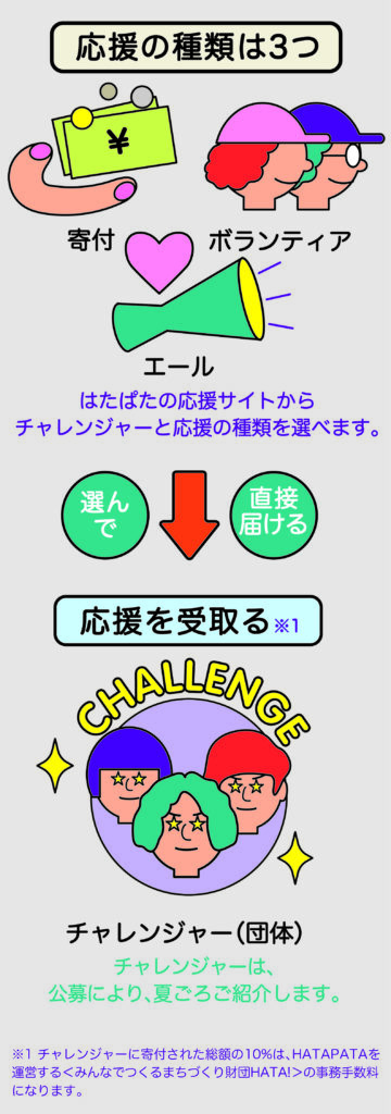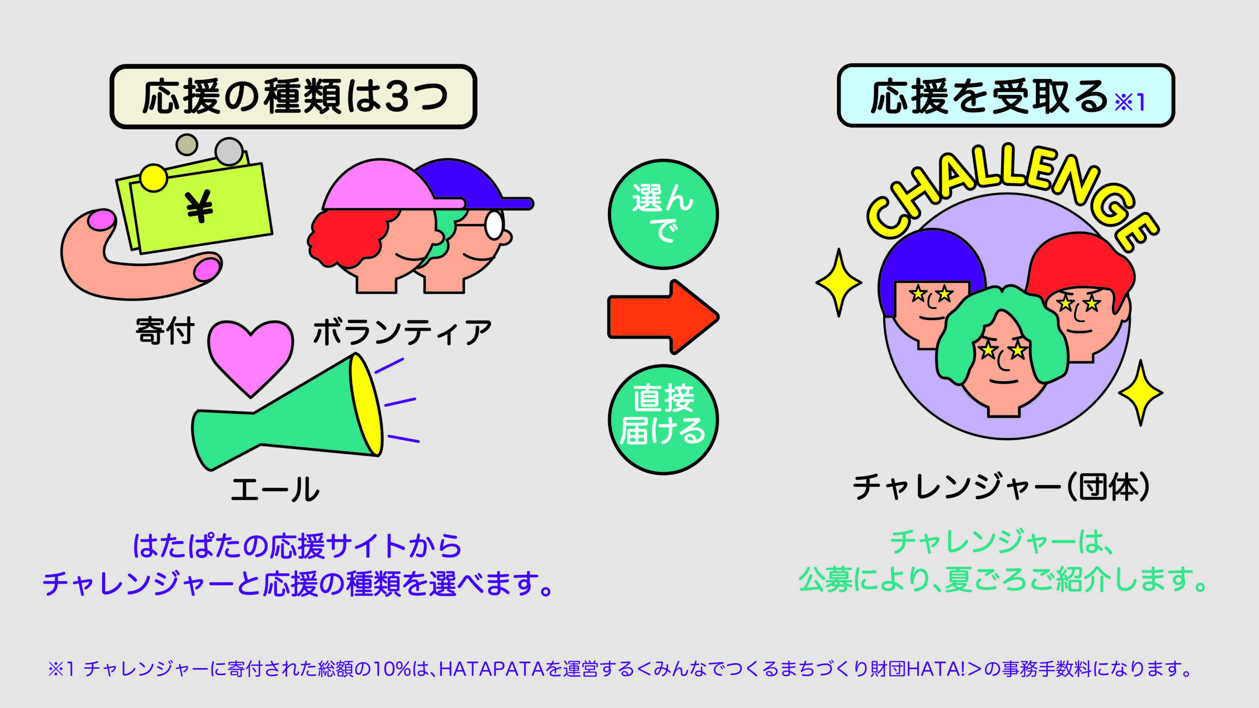 HATA!を盛り上げたい!そう思った時に、自由な金額、自由な回数のご寄付をすることで、HATA!と地域の未来をつくり育てるメンバーとしてご参加していただけるご寄付のしくみです。